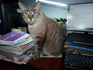 Well I say nothing but this isn't my craft desk this is my computer table. As you can see the lamp I purchased last week is in use. Left is a pile of 'Yours' magazines that require reading some going back months even years. The book on top is my work book, all things I undertake go in here when asked to do them so I don't forget. Behind the cat are replacement inks and as you can see on the screen my blog for this week.